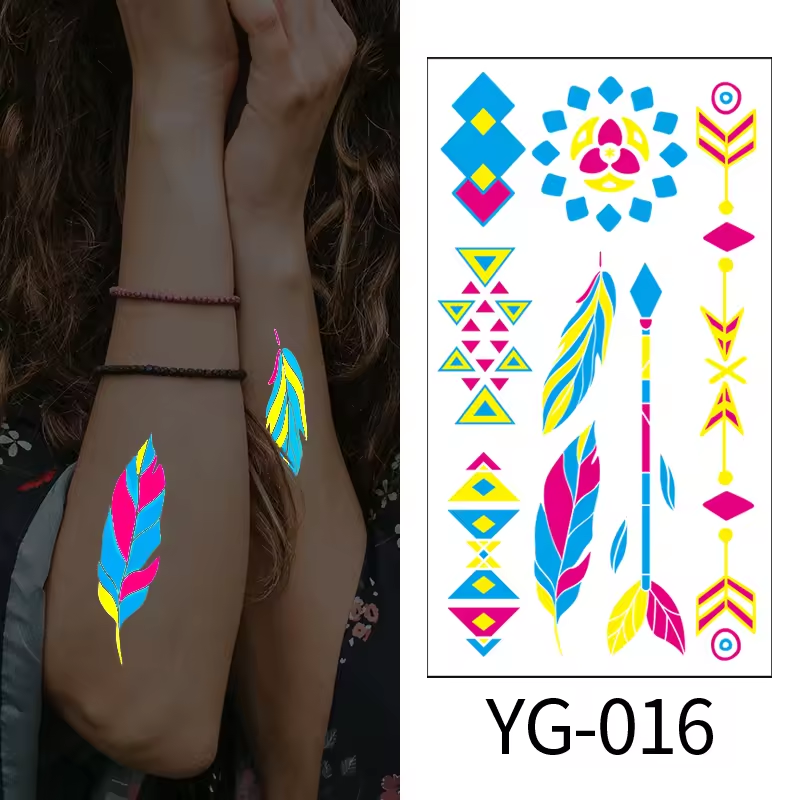 Light-reactive temporary tattoo stickers are a fun and innovative way to adorn your skin with designs that come to life under certain lighting conditions. These tattoos are typically made with UV-reactive ink, which means they remain invisible or subtly visible under normal light but glow brightly when exposed to ultraviolet light, such as that from the sun or blacklight lamps.