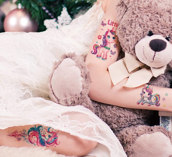 These temporary tattoos come in vibrant colors with sparkling glitter, featuring whimsical designs of unicorns and other enchanting motifs. They are skin-friendly, waterproof, and easy to apply, ensuring they can be worn to parties or during play without worry.