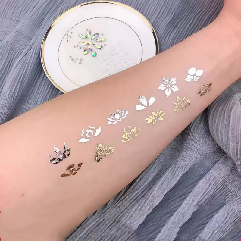 If you are looking for a way to express yourself with body art without committing to a permanent tattoo, you might be interested in our custom or wholesale high quality non-toxic waterproof women men body art flash metallic silver & gold temporary tattoo sticker. These stickers are easy to apply and remove, and they last for up to a week on your skin. They are made of safe and eco-friendly materials that do not irritate your skin or cause allergic reactions. You can choose from our wide range of designs or create your own with our custom service. Whether you want to add some sparkle to your outfit, make a statement, or have some fun with your friends, our temporary tattoo stickers are the perfect choice for you.