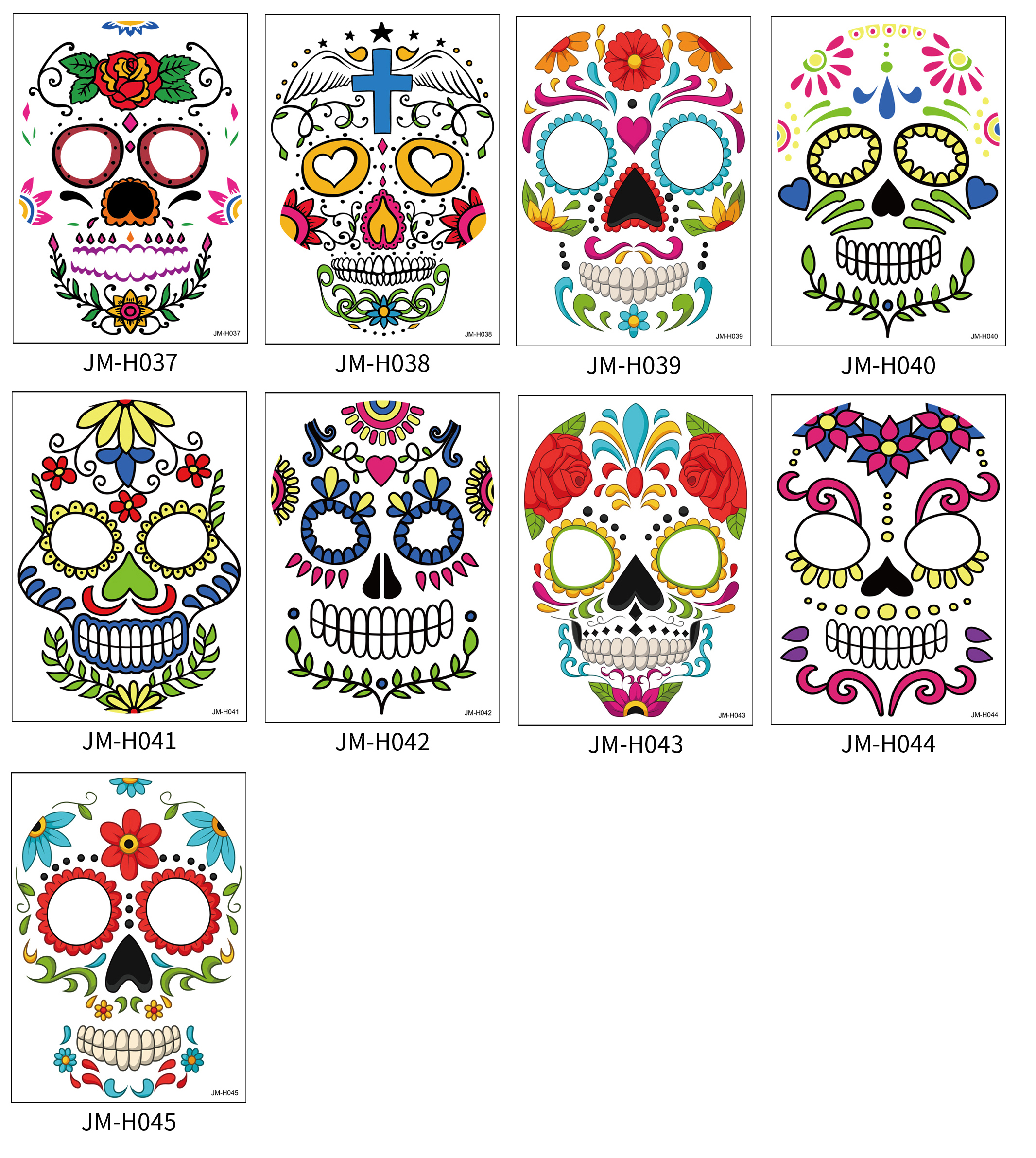 Costume Halloween Face Makeup Tattoo Stickers are vibrant and detailed temporary tattoos designed to complement Halloween costumes. They feature a variety of spooky designs like ghosts, witches, zombies, and skeletons. These stickers are waterproof and easy to apply, lasting throughout the night even with sweat or exposure to water. They’re perfect for adding a dramatic touch to any Halloween look, and can be easily removed with oil-based makeup remover.