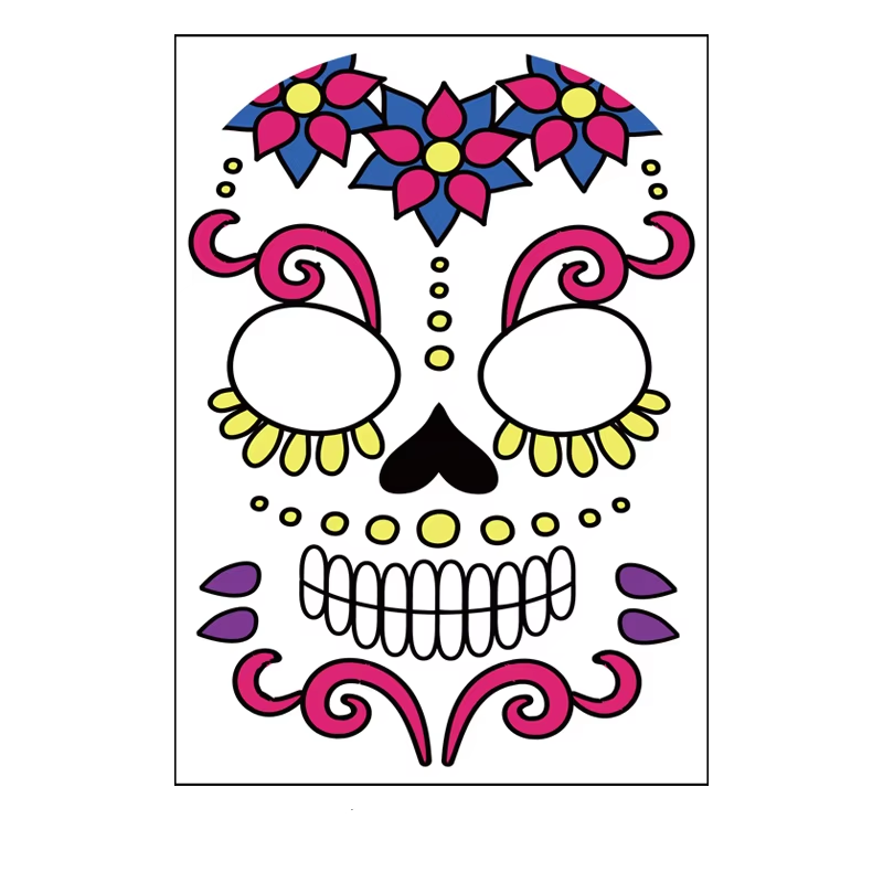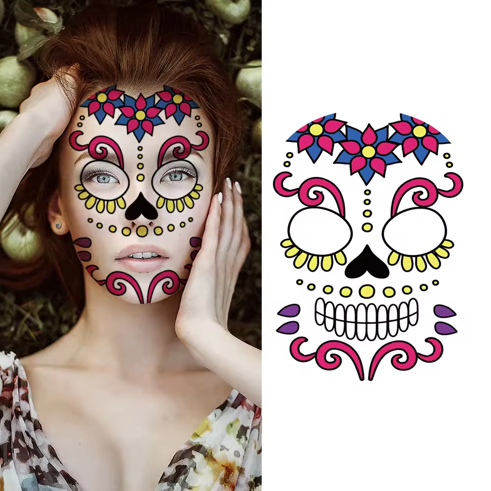 Costume Halloween Face Makeup Tattoo Stickers are vibrant and detailed temporary tattoos designed to complement Halloween costumes. They feature a variety of spooky designs like ghosts, witches, zombies, and skeletons. These stickers are waterproof and easy to apply, lasting throughout the night even with sweat or exposure to water. They’re perfect for adding a dramatic touch to any Halloween look, and can be easily removed with oil-based makeup remover.