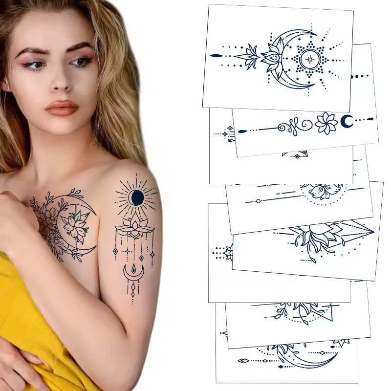 Genipin-based temporary tattoos are a popular choice for those looking to enjoy body art without the permanence of traditional tattoos. These stickers are known for their long-lasting wear, often up to several days, and are waterproof, making them ideal for various occasions, from daily wear to special events. Additionally, they come in a variety of designs, such as the Henna Moon Planet Bear or Electric Guitar Bass, catering to diverse aesthetic preferences. Moreover, the semi-permanent nature of these tattoos allows for experimentation with different styles without long-term commitment.