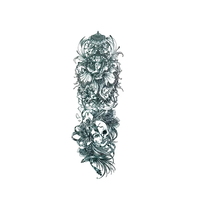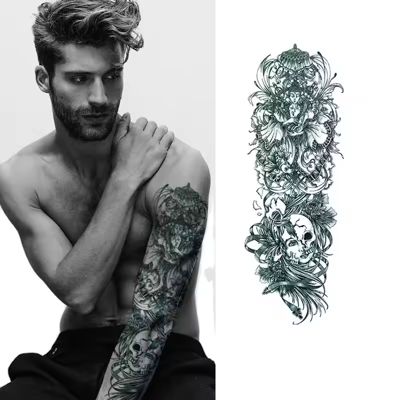 The Full-arm Tattoo Sticker is a new cross-border model that offers a waterproof and sweatproof experience, perfect for those seeking a realistic and personalized body art option. It features a striking black and white design with themes of crosses and Buddha, providing a dazzling visual effect.