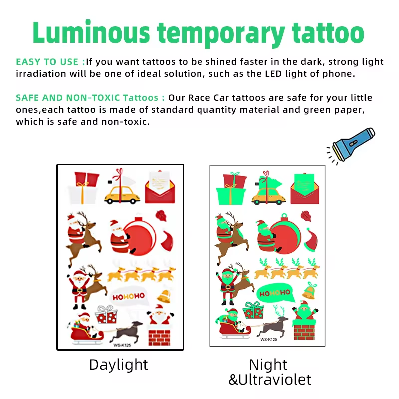 Luminous Christmas Party Fake Temporary Tattoos are festive body decals that glow in the dark, adding a magical touch to holiday celebrations. They feature Christmas-themed designs like Santa Claus, snowmen, and reindeer, and are perfect for parties, as they are waterproof, easy to apply, and safe for all ages. These tattoos absorb light and then shine brightly under UV light, creating a fun and unique way to celebrate the season.