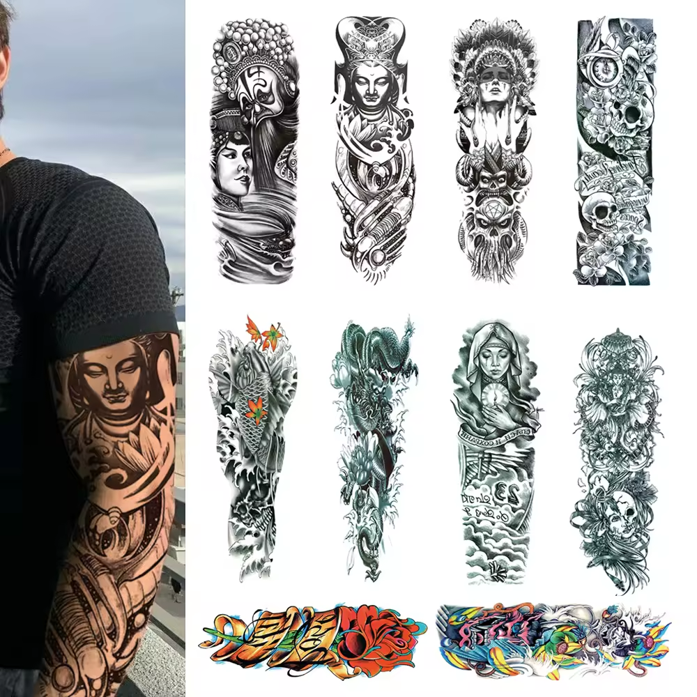 Religion Full Arm Temporary Tattoo Stickers are designed to cover the entire arm with various religious symbols and imagery. They often feature crosses, angels, saints, and other spiritual icons, offering a way to express faith and spirituality temporarily. These stickers are waterproof, easy to apply, and can last for several days, providing a realistic tattoo look without the commitment.