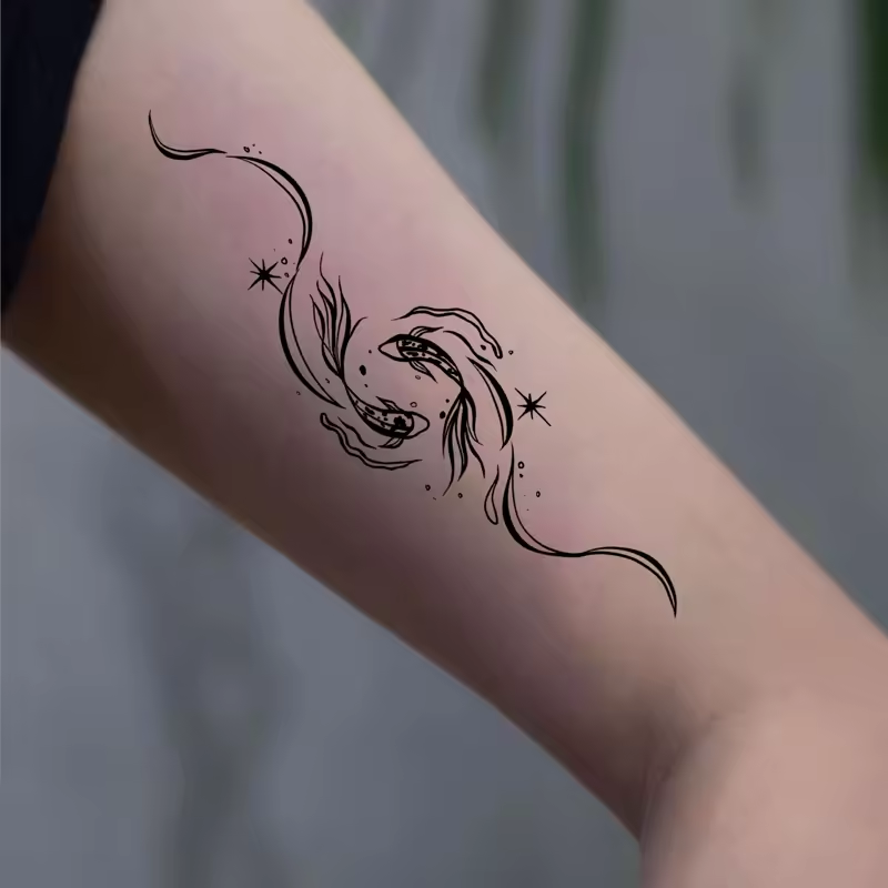 Semi-permanent Tattoos with Two Gold Fish are temporary tattoos that feature a pair of goldfish in a cartoon-inspired design. They are painless to apply, water-resistant, and can last up to two weeks, offering a playful aquatic-themed body art option without the permanence of traditional tattoos.