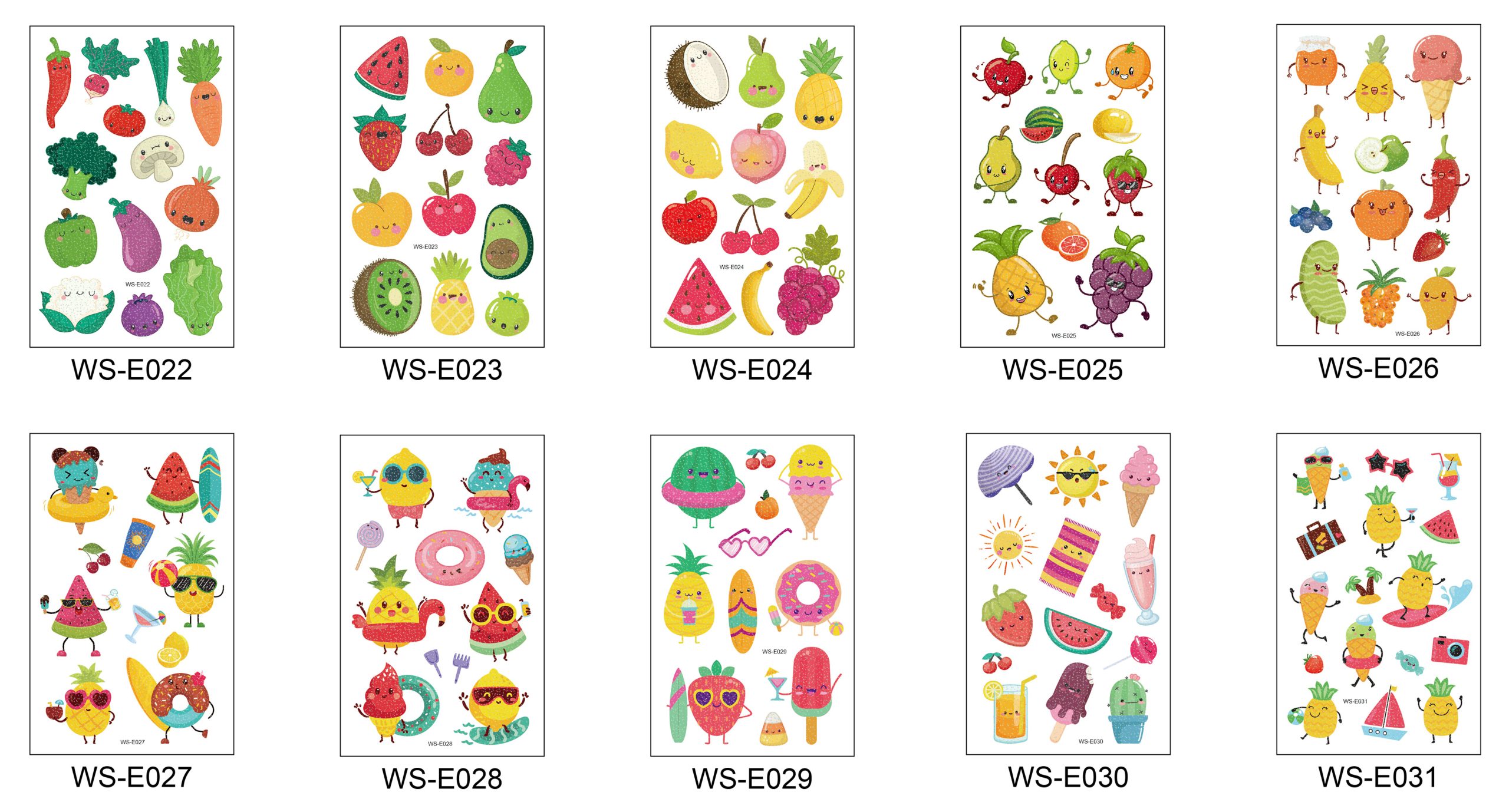 Summer Fruit Glitter Temporary Tattoo Stickers are playful and sparkly body decals featuring a variety of summer fruit designs like watermelon, strawberry, and pineapple. They’re waterproof, easy to apply, and can last about 3-6 days, perfect for kids’ parties or summer fun.